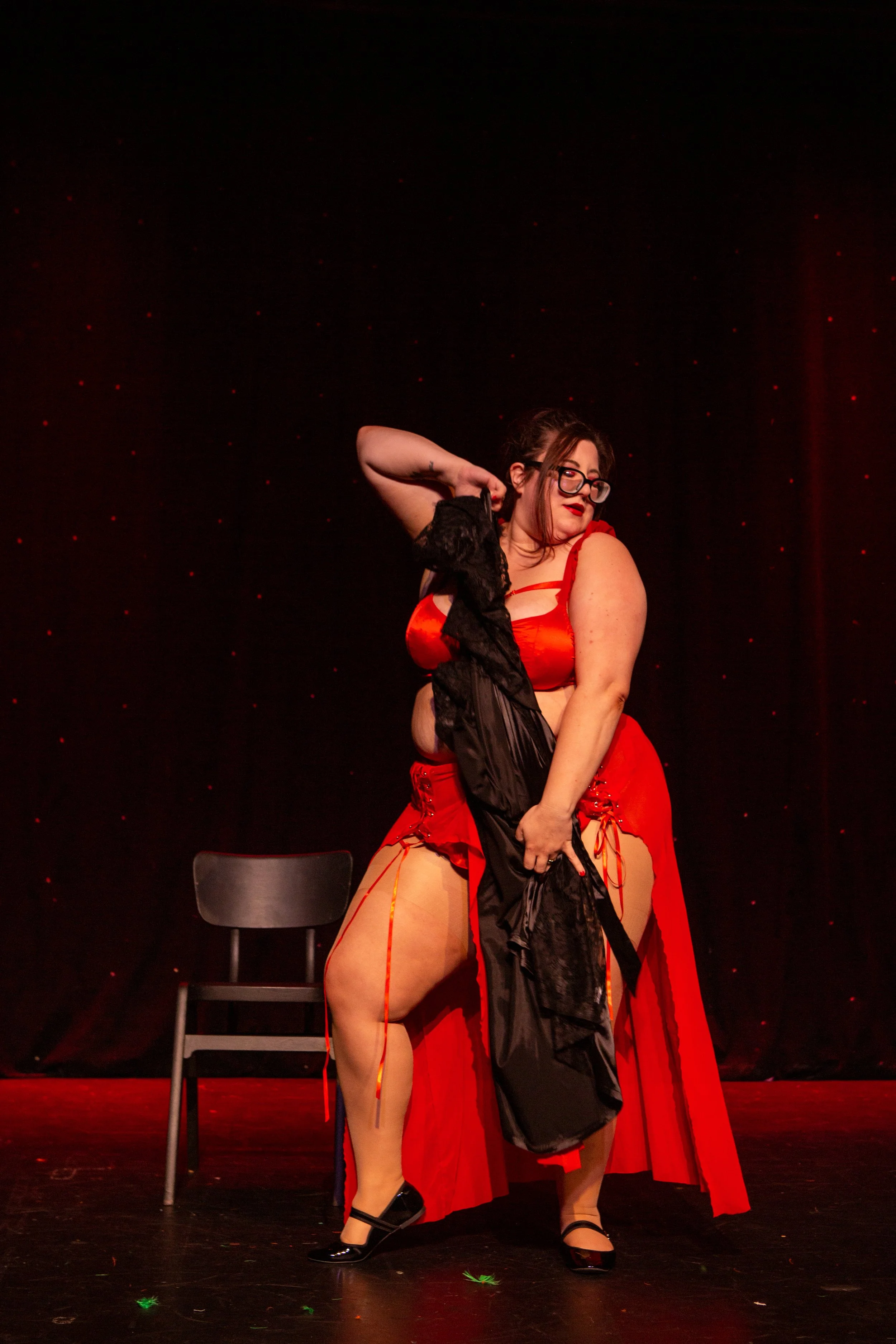Violet Grace followed with a hauntingly powerful performance to The Devil Wears Lace. Wrapped in flowing black satin and dramatic wings, she delivered dark elegance and intensity. As layers were stripped away to reveal bold red lingerie beneath, her controlled chair work and dramatic reveals held the audience completely captivated.